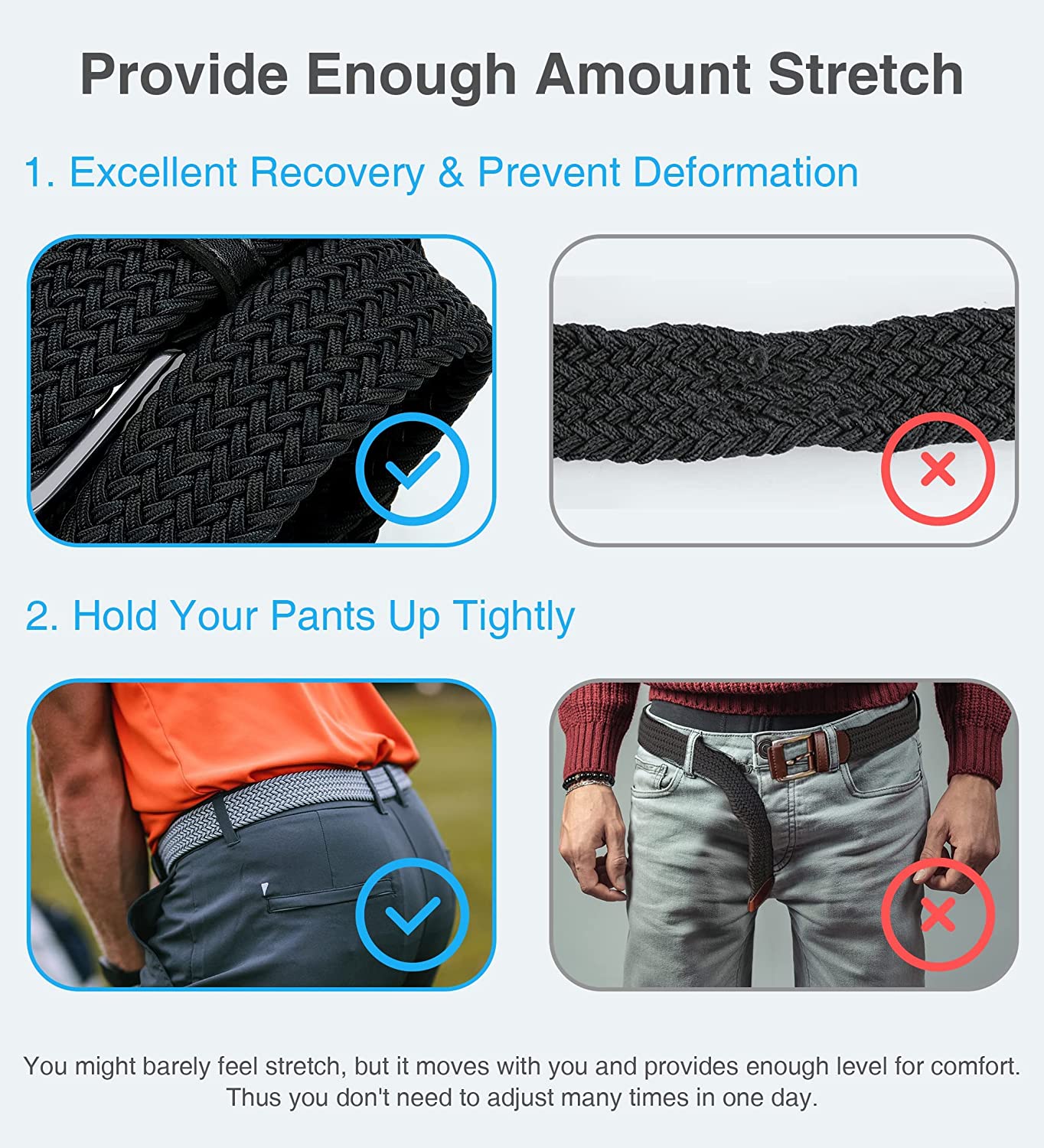 【Enhanced Pin】: Khaki stretch belts for men adopt reinforced metal material, will not break easily, allergic proof & rust proof. No hole design braided belt provides breathability, also enables the buckle to lock in any position for perfect fit.
