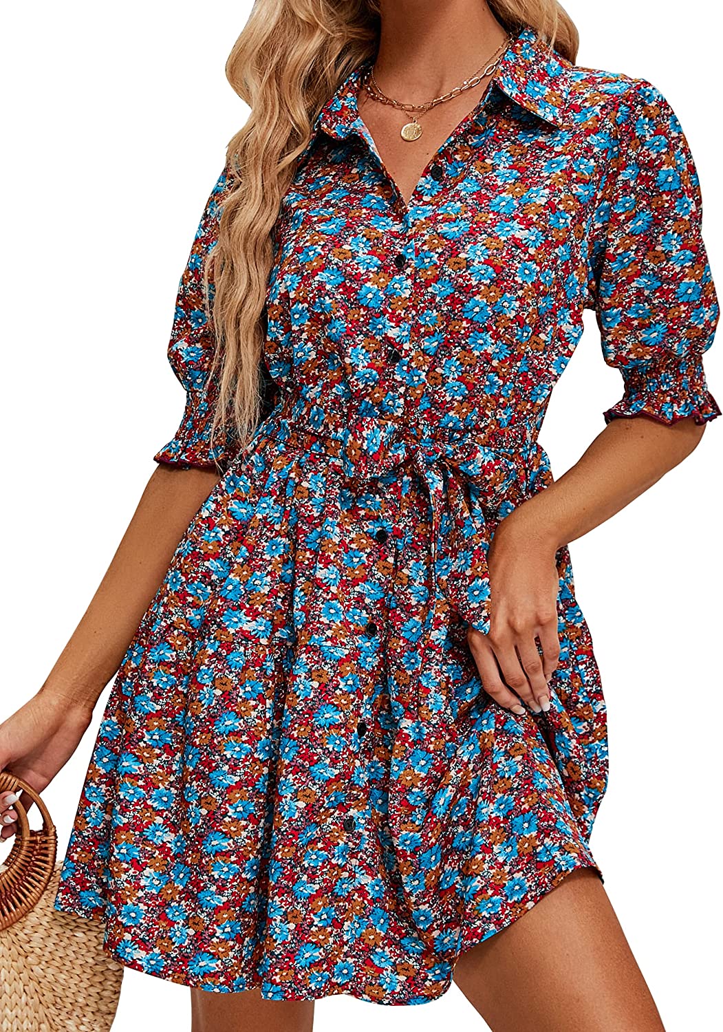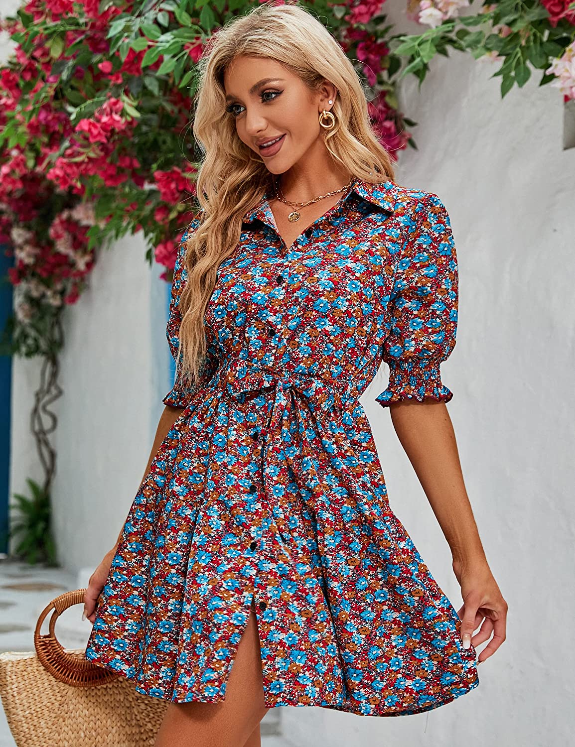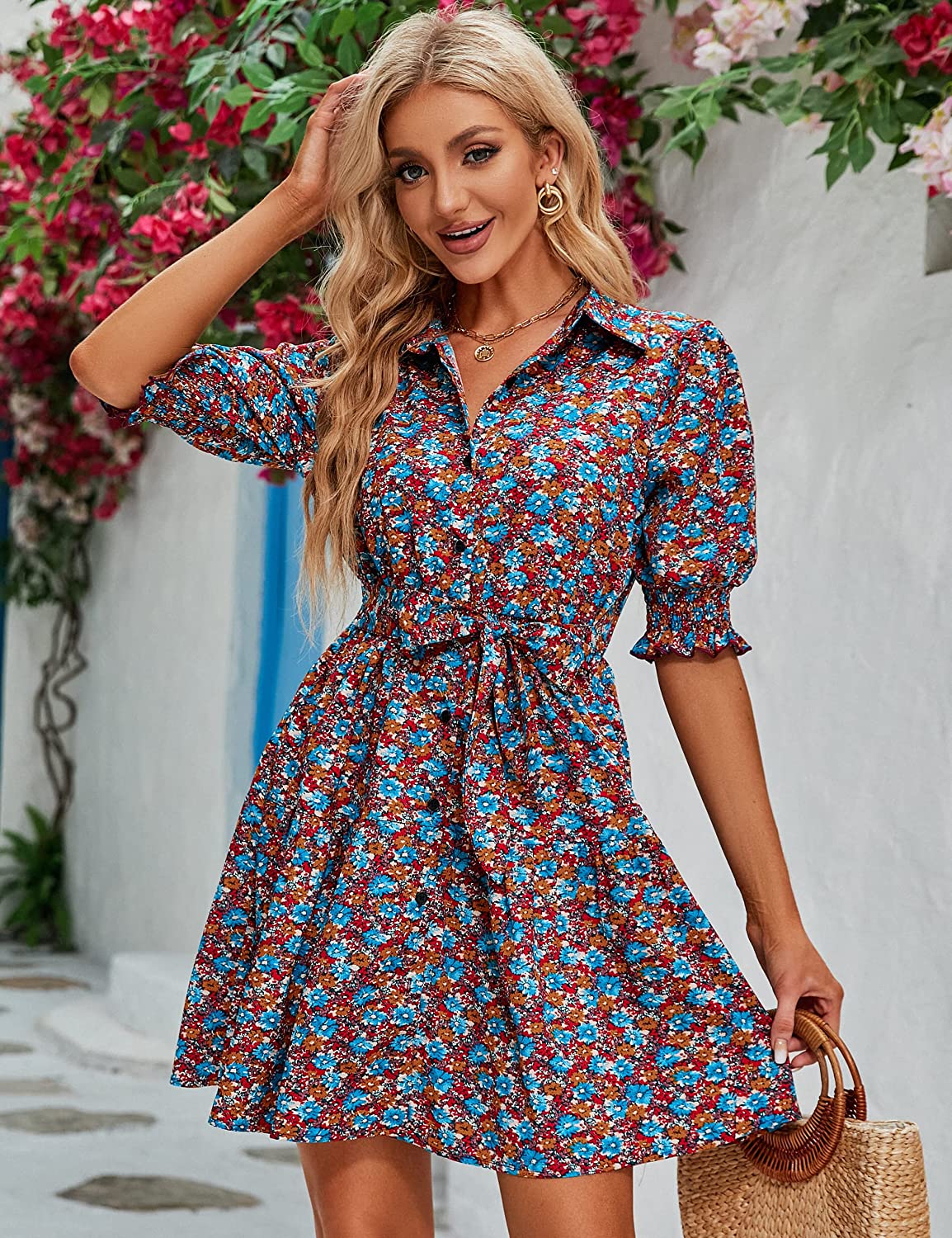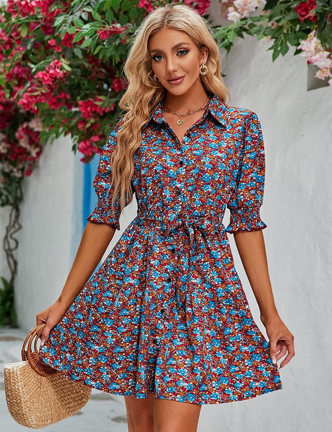• Feature: Womens summer dresses feature square neck, puff short sleeve with elastic cuffs which also can be sexy off shoulder, stretchy smocked bust design, elastic empire waist with cute ruffle, tie open back, 2 pockets, floral print, above knee length, a line baby doll silhouette, releaxed fit.