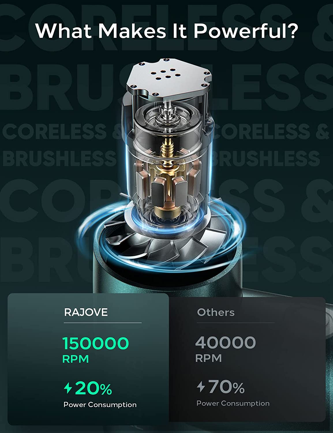 - [More Efficient Dust Removal] As you know, the canned type need to be replace constantly and the ordinary rechargeable air duster is not stronger enough for dust removal. RAJOVE air duster compressed air provides you the perfect solution. By adopting an innovative coreless & brushless motor, it provides 90% stronger blowing force than the ordinary, the motor speed is up to 150000 RMP while reducing the power consumption down to 20%! Make the complicated dust removal job easily done in 1 minute!