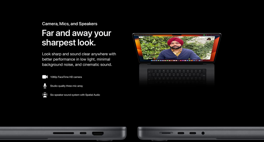 ADVANCED CAMERA AND AUDIO — Look sharp and sound great with a 1080p FaceTime HD camera, a studio-quality three-mic array, and a six-speaker sound system with Spatial Audio.