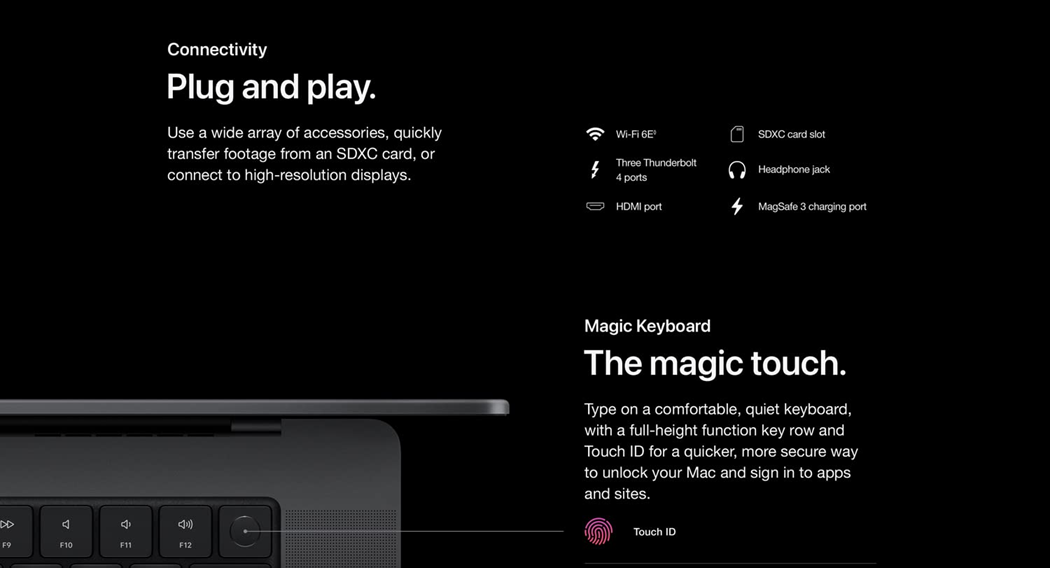 CONNECT WHAT YOU WANT — MacBook Pro features a MagSafe charging port, three Thunderbolt 4 ports, an SDXC card slot, an HDMI port, and a headphone jack. And enjoy seamless wireless connectivity with Wi-Fi 6E and Bluetooth 5.3.