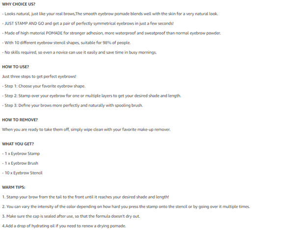 • 【PERFECT BROWS IN MOMENTS】 Pressed for time in the morning? With our eyebrow kit JUST STAMP AND GO and get a pair of perfectly symmetrical eyebrows in just a few seconds!No skills required, so even a novice can use it easily and save time in busy mornings.