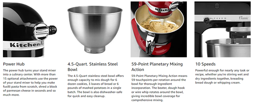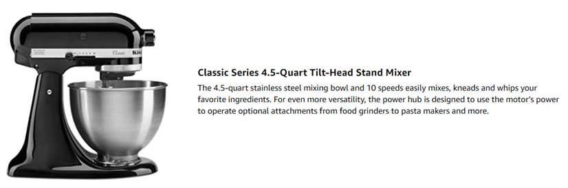 The KitchenAid Classic Series Tilt-Head Stand Mixer includes a 4.5-quart stainless steel mixing bowl and 10 speeds to easily mix, knead and whip your favorite ingredients. For even more versatility, the power hub is designed to use the motor's power to operate optional attachments from food grinders to pasta makers and more.