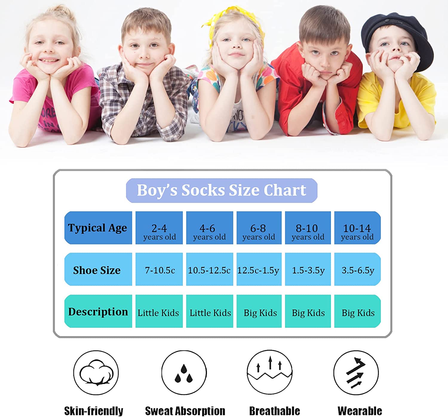 4 SIZE TO CHOOSE: Tsmollyu boys ankle socks have 4 sizes to choose, Small: 2-4T (Shoe size 7-10.5 Toddler); Medium:4-6 Years (Shoe size 10.5-12.5 Little Kid); Large: 6-8 Years (Shoe size 12.5-1.5 Big Kid); X-Large: 8-10 Years (Shoe size 1.5-3.5 Big Kid); Please choose according to your boys shoe size,Kids of these ages can enjoy this funny ankle socks in all seasons