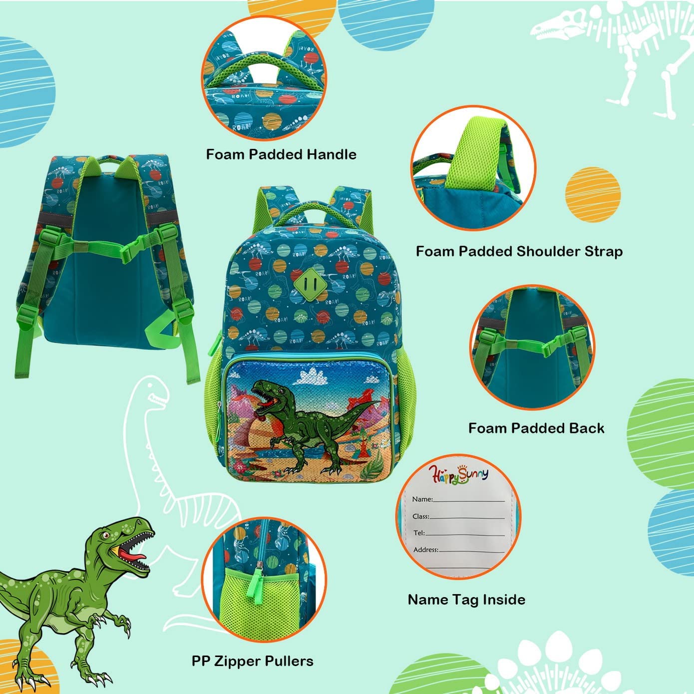 HAPPYSUNNY 16 Inch Dinosaur Backpack for Kids 5-7 Boys and Girls 3-5 Reversible Sequins Kids Backpack for Preschool Early Elementary Kindergarten Bookbags with Chest Strap