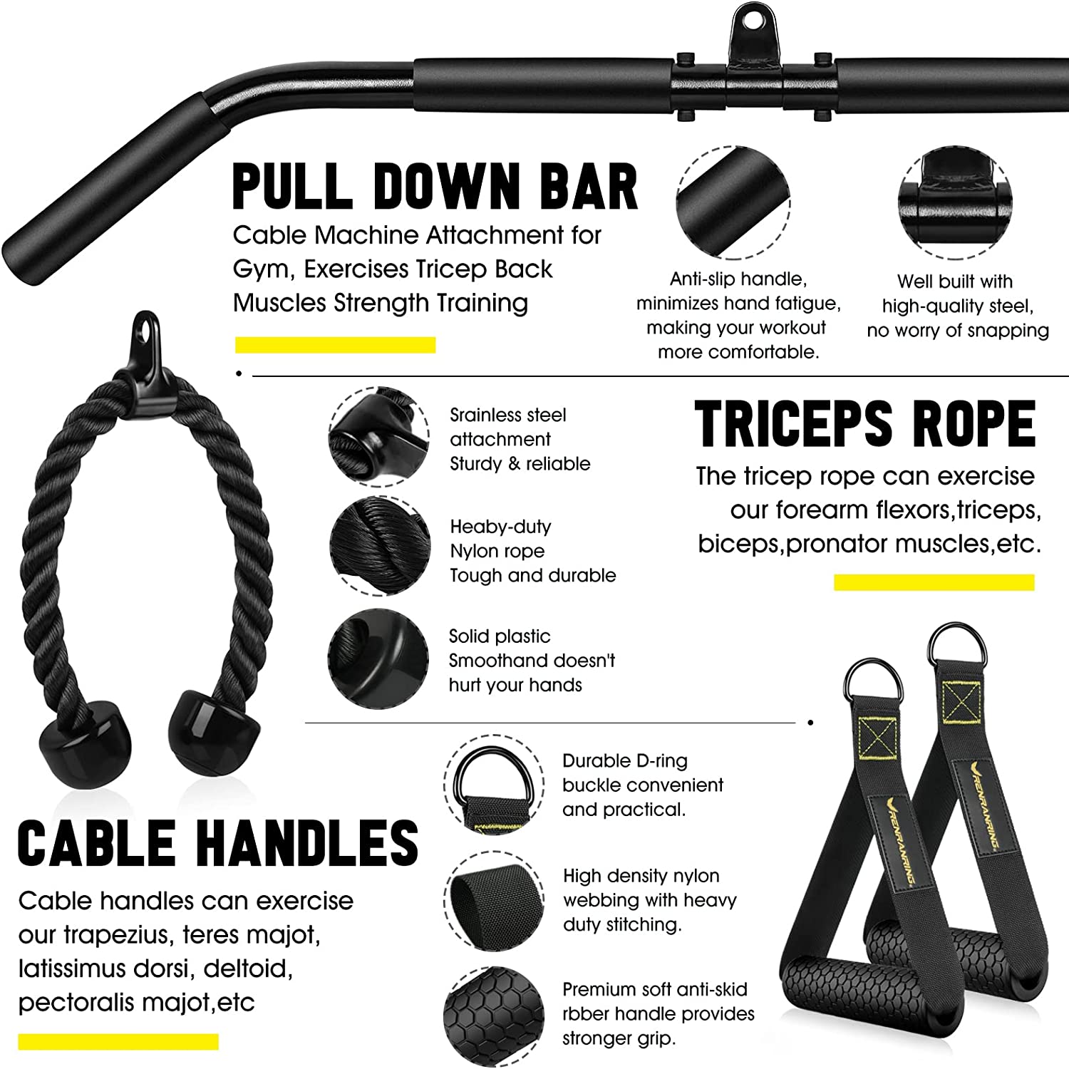 - ?【Three Deteachable Handles】We provide you with 3 detachable handles, allowing you to freely change the gym attachment you want; ① Tricep rope: used for triceps push down, Biceps flexion and multi-row movements. ②Honeycomb type handles: can exercise chest muscles by chest expansion and clamping, better non-slip to help you exercise more effectively. ③ LAT pull bar: used for pull-up/pull-down training, exercise arm wrist and forearm strength.