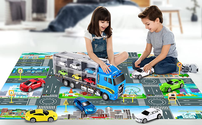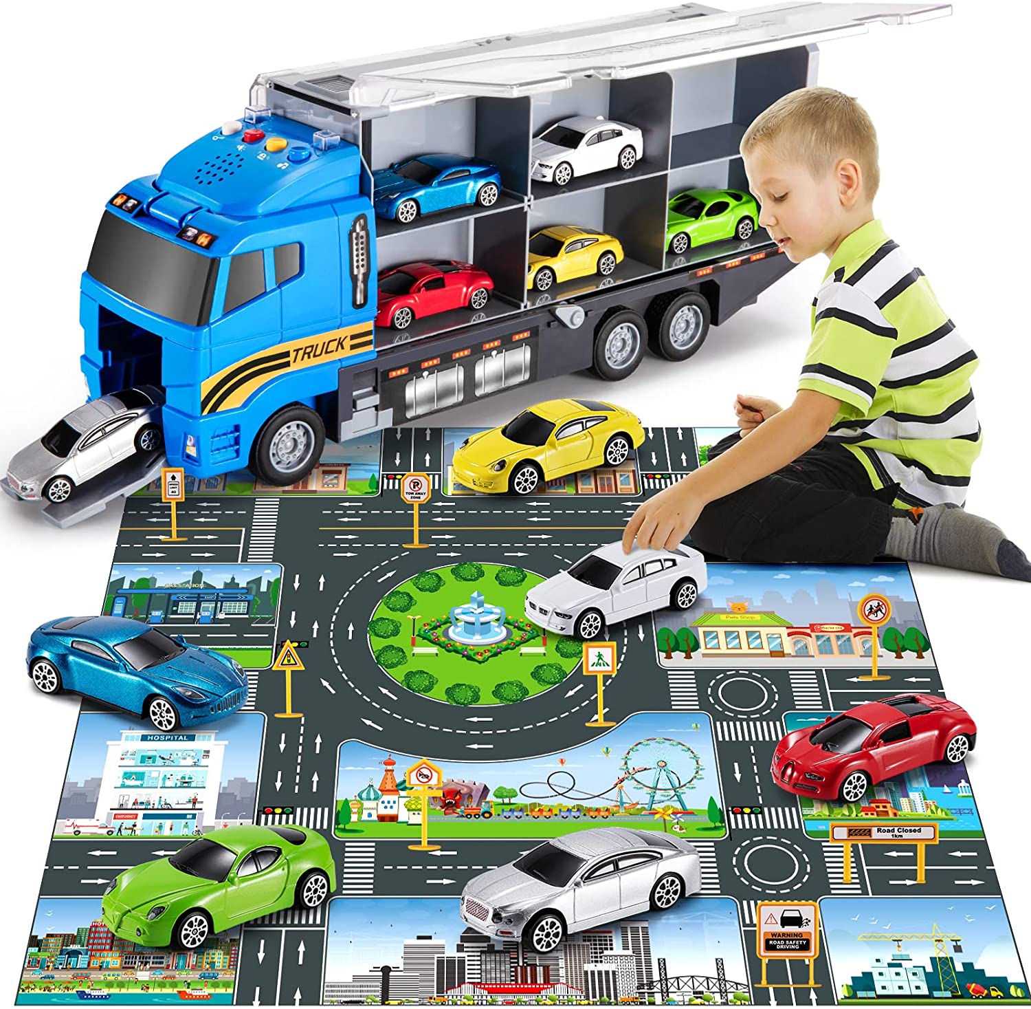 - KIDS RACE CAR TOYS SET - Equipped with 1 x foldable play mat, 1 x multi-function transport cars, 6 x different colorful die cast race cars and a set of road signs. It is highly recommended for kids aged 3 and above to create endless happy times!