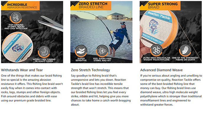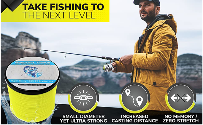 REACTION TACKLE HIGH QUALITY BRAIDED FISHING LINEReaction Tackle is located in Wisconsin. Everything is shipped from warehouses located in the USA.No need to overpay for brand name fishing line! Reaction Tackle high quality fishing braid is just as good as, if not better than, the most popular brands.Reaction Tackle 4 and 8 strand braided fishing line is made from UHMWPE, the world’s strongest fiber.We currently offer the most popular colored fishing braid such as: yellow, orange, blue, multicolor, green, camo, black, hi viz, neon, fluorescent, red, white, brown and more colors coming soon.Reaction Tackle braided line is coated for extra durability and flies through fishing guides to provide extra long casting distance. Our heavy lines can even be used for downrigger line at any depth. Braided line is a great alternative to monofilament or fluorocarbon lines use in your favorite ocean, stream river or lake.Customer satisfaction is our number one priority, give our products a chance. If you are not completely satisfied feel free to contact us and we will do whatever it takes to keep our customers happy.