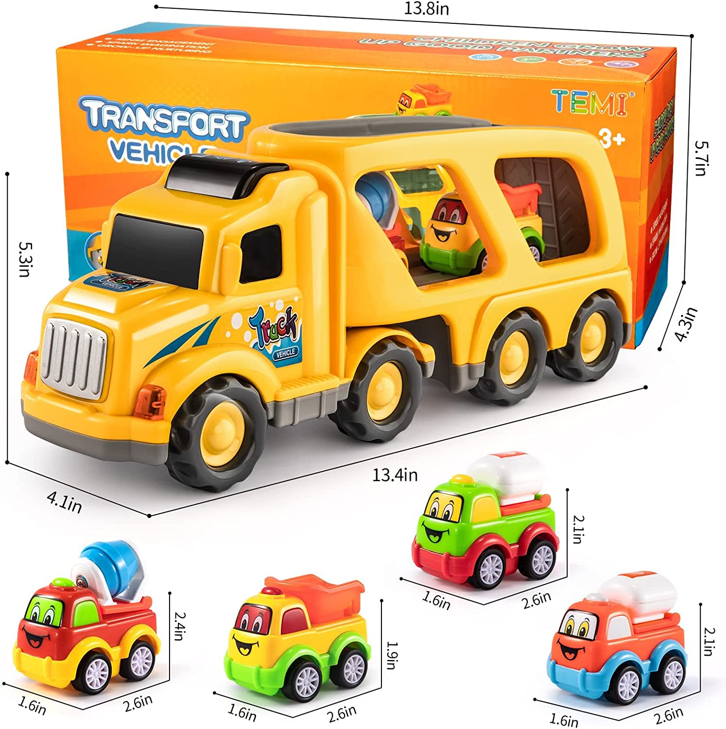 - 5 in 1 Colorful Value Package: TEMI construction carrier truck toy includes a larger transport truck and 4 mini colorful cement mixers / dozers / water trucks. The bodies of these small engineering vehicles can turn and flip, and children will be immersed in them to build their building base for toddler age 1-3.