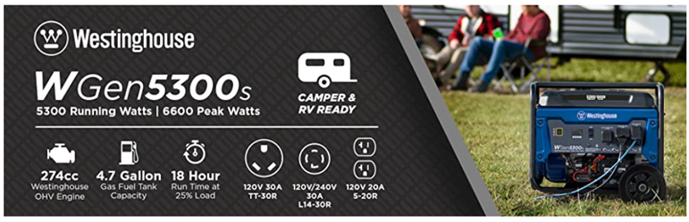 The Westinghouse WGen5300s is a versatile solution for all your power needs from your home to your RV when you’re looking for a dependable backup power supply. The WGen5300s produces 6,600 peak watts and 5,300 running watts with a powerful 274cc 4-Stroke OHV Westinghouse Engine constructed for durability. Running for up to 14.5 hours on a 4.7 gal. (18L) tank of gas, it's conveniently equipped with a built-in fuel gauge, automatic low oil shutdown, and electric start with manual choke. The L14-30R outlet is Transfer Switch Ready to supply total household power which eliminates the hassle of annoying extension cords or power strips. Combined with an RV Ready TT-30R outlet, you can ensure your recreation vehicle or home is ready to go for air conditioners, refrigerators, sump pumps, and home necessities. The intuitive control panel includes the Digital Readout to share real-time updates on maintenance information and a 120/240 Volt Selector Switch to draw more power with added flexibility for appliances like a well pump. Engineered into a compact hardened-steel frame with never-flat wheels, it's easy to bring this generator from storage to use. The WGen5300s Portable Generator is complete with a 3-Year limited service, labor, and parts coverage with Lifetime Technical Support to ensure your confidence can be backed by our nationwide customer service and support network.