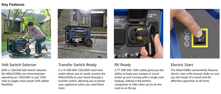 | Model Name | WGen5300s Portable Generator with Electric Start and 120/240 Volt Selector |
