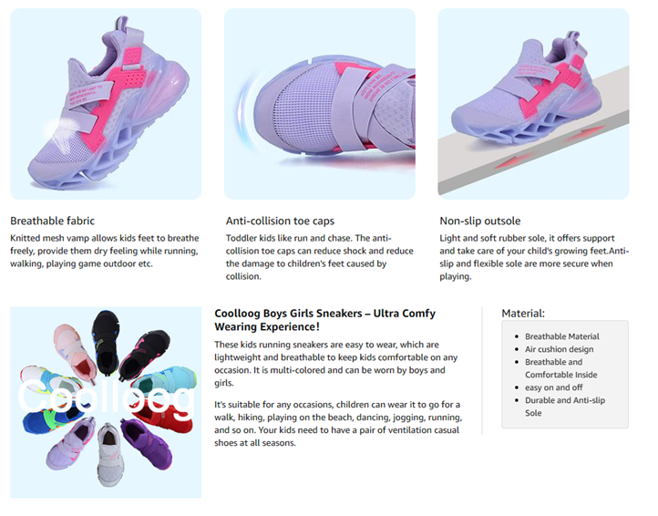 Rubber material with Air cushion midsole effectively reduce the shock of running. Anti-slip rubber sole to ensure the safety of kids